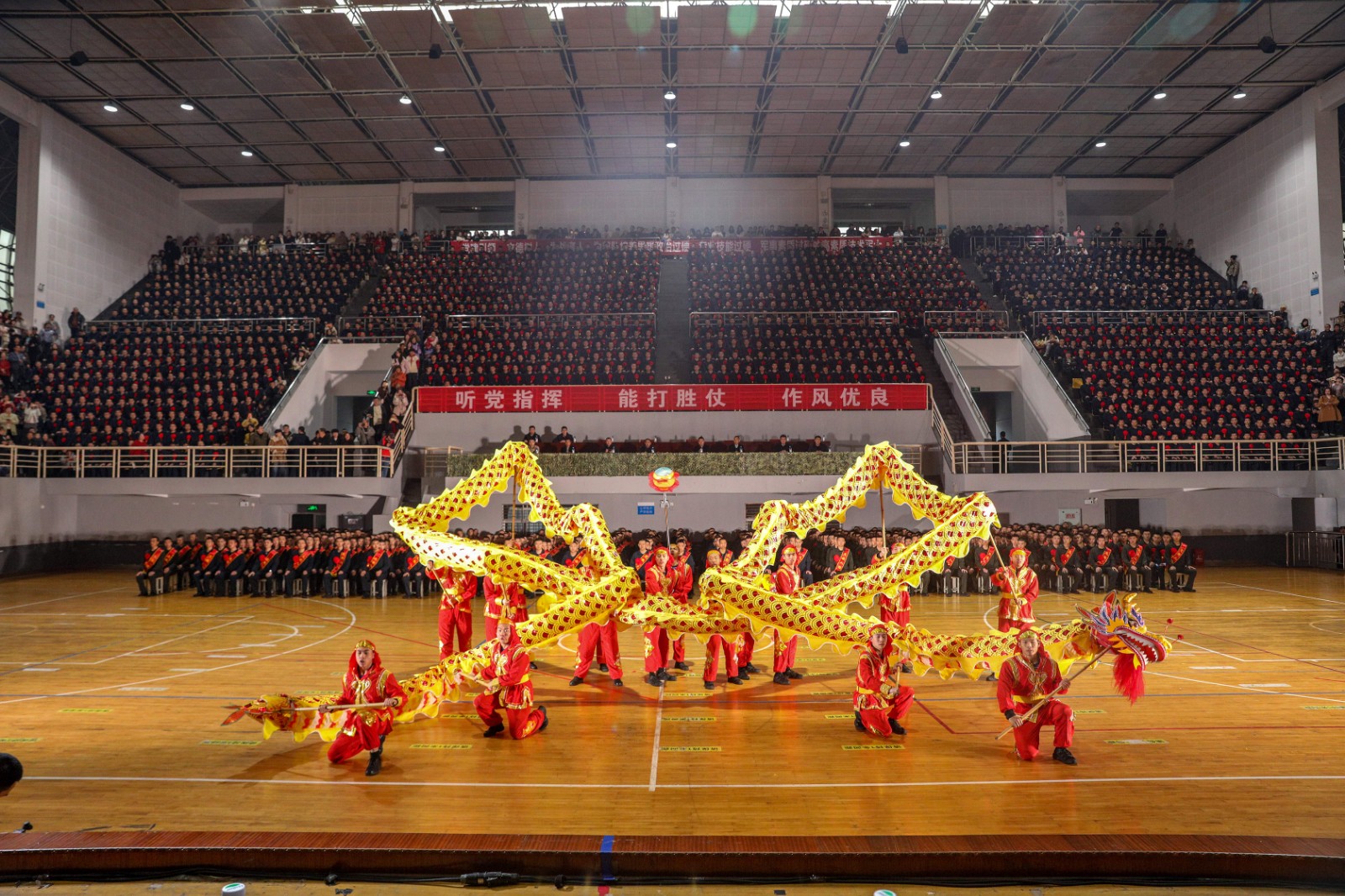 欢送仪式前,极具传统文化特色的舞龙舞狮表演作为开场环节精彩上演,伴随着歌曲《男儿当自强》《日出峨眉》的激昂旋律,表演者们精神抖擞、动作矫健,金龙与雄狮灵动翻飞、腾挪闪转,展现出威风凛凛的雄壮气魄,流露出磅礴壮阔的恢弘气势,生动诠释了学院师生奋发图强、追求卓越的精神风貌,为整个仪式奠定了振奋人心、昂扬向上的情感基调。