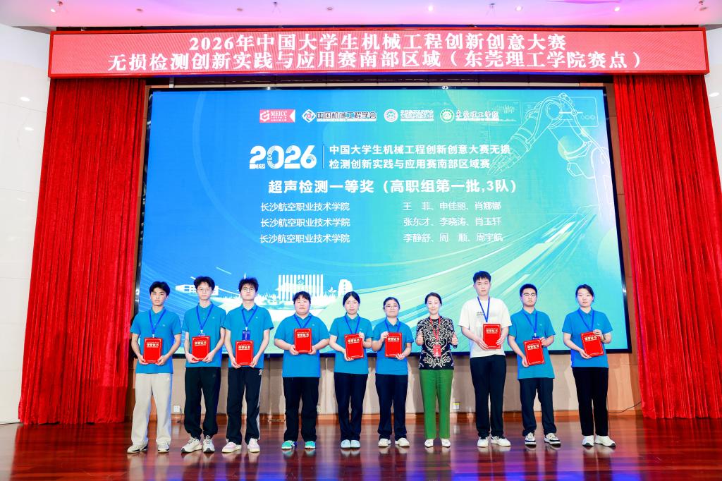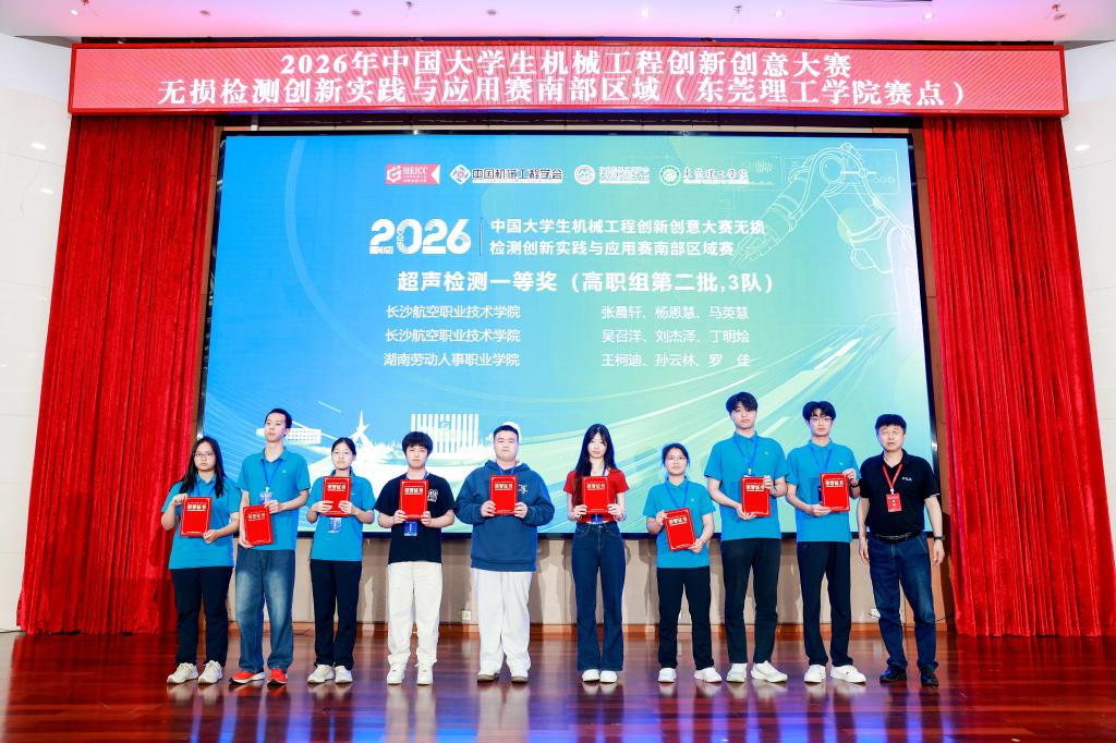 近日,2026年中国大学生机械工程创新创意大赛——无损检测创新实践与应用赛南部区域决赛在广东东莞圆满落幕。由我院机电学院理化测试与质检技术专业选派的14支学生代表队表现出色,凭借扎实的技能功底与出色的专业素养,最终斩获一等奖6项、二等奖6项、三等奖2项的辉煌战绩。其中,在竞争最为激烈的超声检测技术(高职组)赛项中,我院学子表现尤为突出,一举包揽该赛项前5个一等奖席位,冠军团队的卓越表现赢得了赛事评委及各兄弟院校的广泛赞誉。